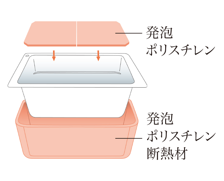 断熱材で包み込んだ浴槽と専用保温組みフタで快適温度を長時間キープ。追い焚き回数を減らせる省エネ・省コスト仕様。