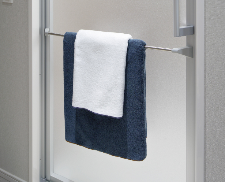 浴室ドア外側には空間に馴染むシンプルなデザインのタオルバーを設置。