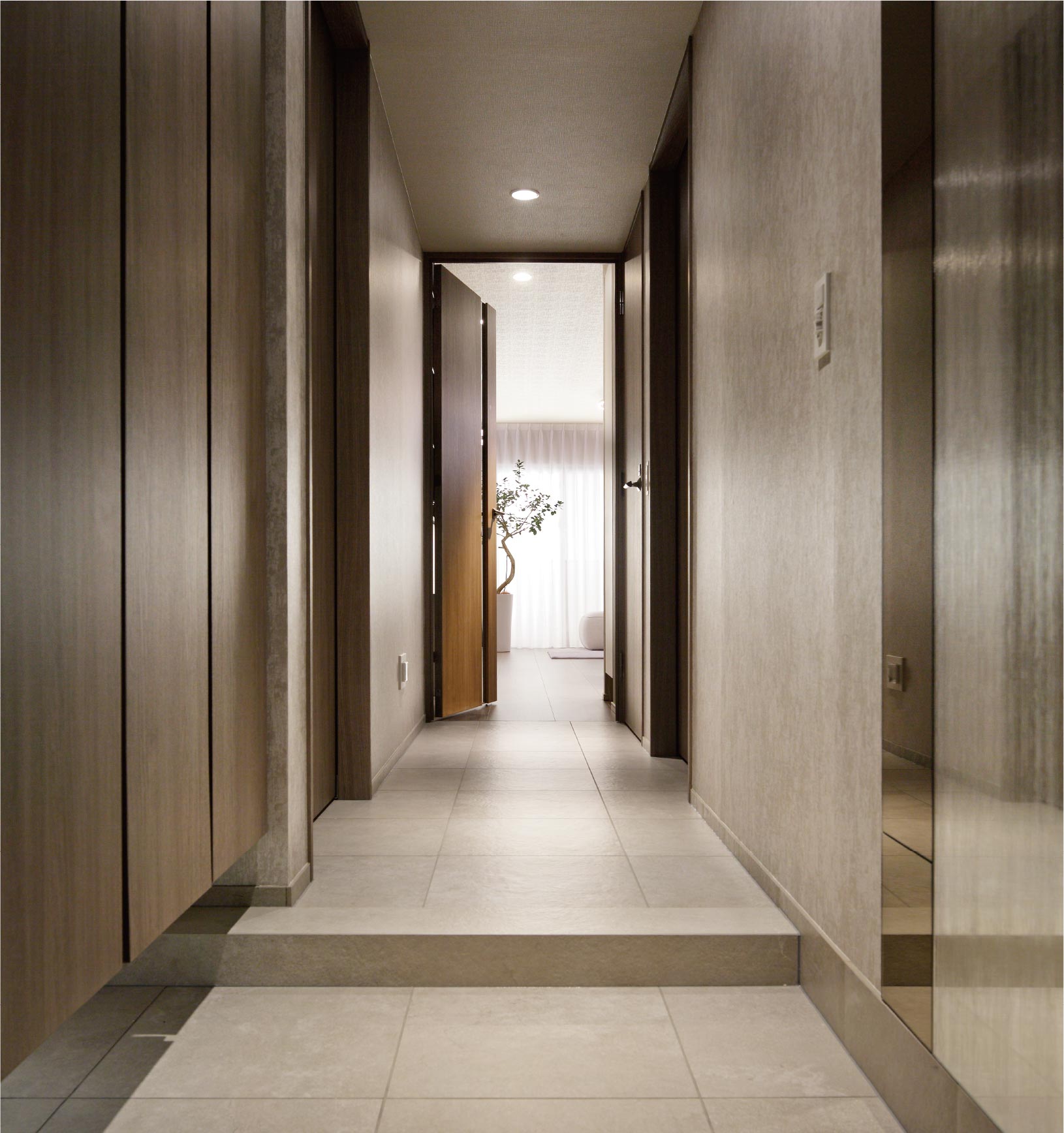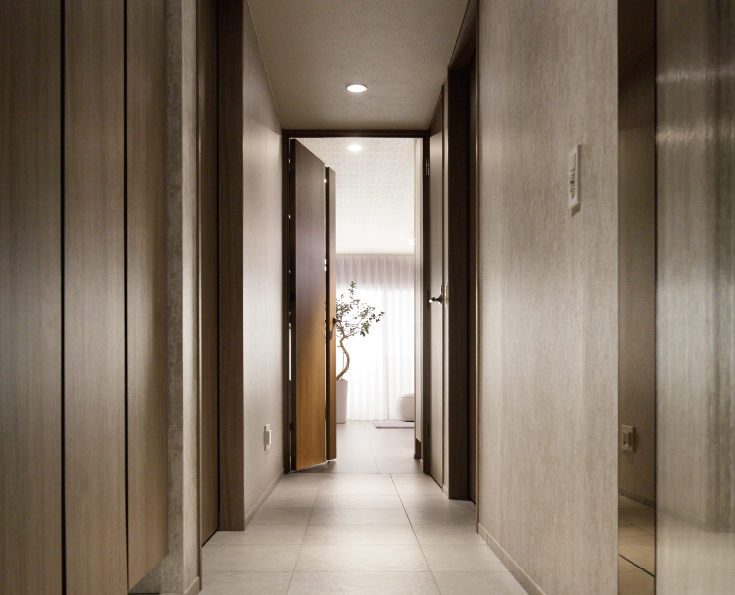 玄関の床面はもちろん、廊下の床面にも高級感の漂う大理石調タイルを採用。統一された床材とすることで、玄関から廊下まで一体感を生み、空間としての広がりを演出することができます。