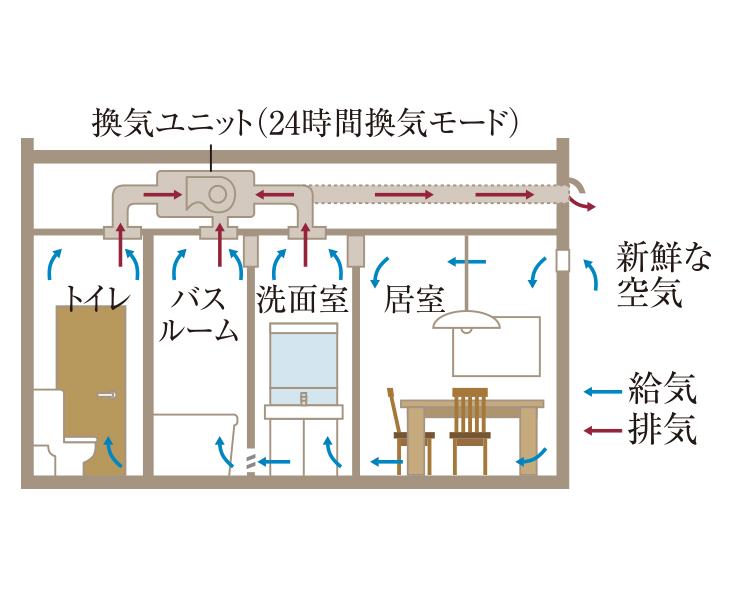 各居室の外気洗浄フィルター付自然給気口から新鮮な空気を採り入れ、浴室暖房乾燥機から室内の空気を排出します。