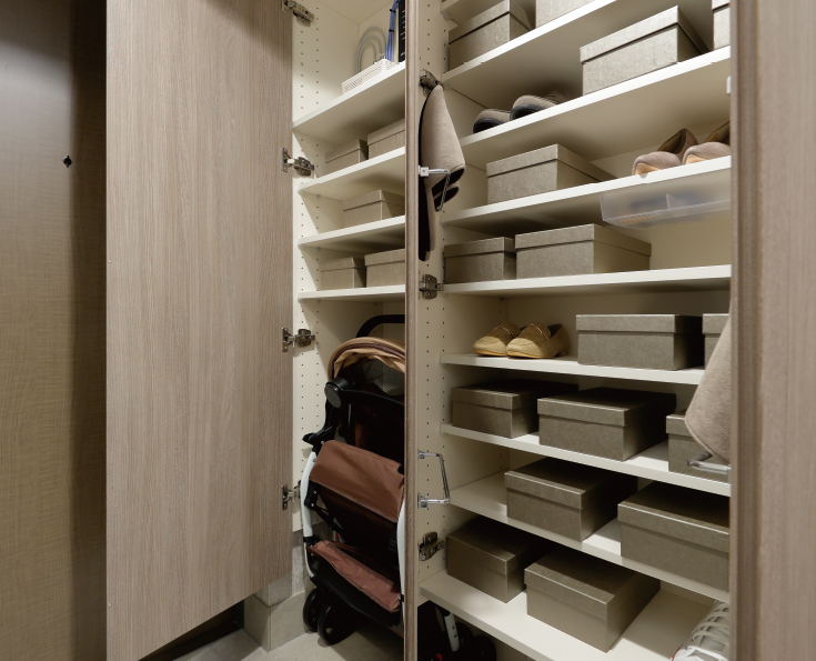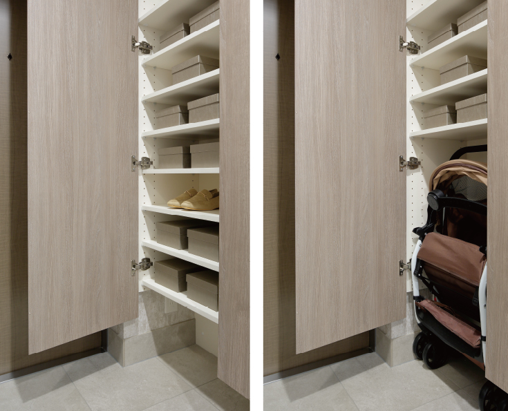 エントランス収納の底板部分を取り外せるマルチな仕様。全ての底板が外れるのでブーツを置いたり、大型のゴルフバックやベビーカーなどの収納に便利です。