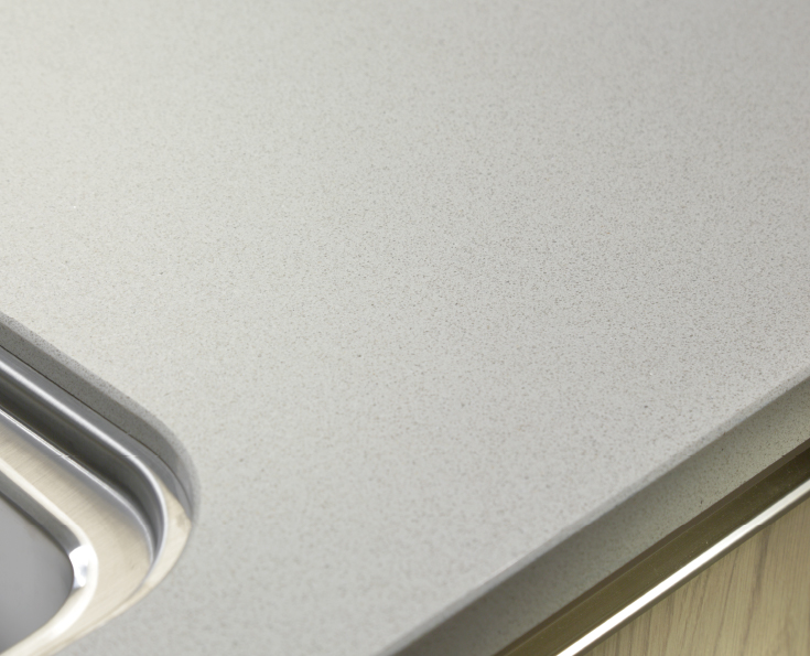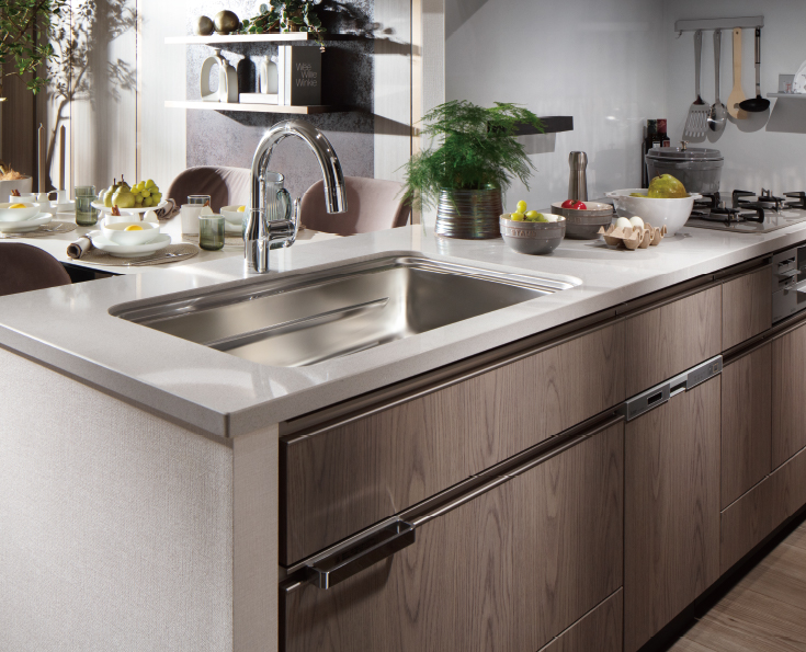 キッチンの天板には、天然水晶を主成分とした高級人造石「フィオレストーン」を採用。天然石の質感があり、汚れにくい特徴もあります。