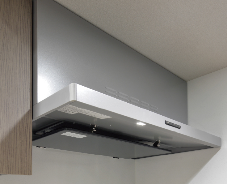 スタイリッシュな整流板付レンジフード。また、排気効率の良いホーロー整流板付きでお手入れも容易です。