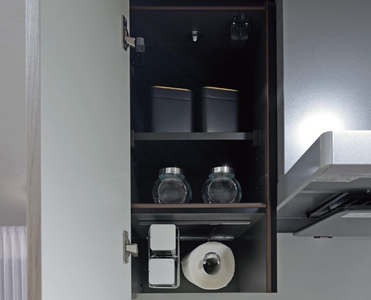 キッチンに対震ラッチ付きの吊戸棚を設置。ハンガータイプの収納付きなので、キッチンペーパーや調理に使う小物を効果的に収納できます。