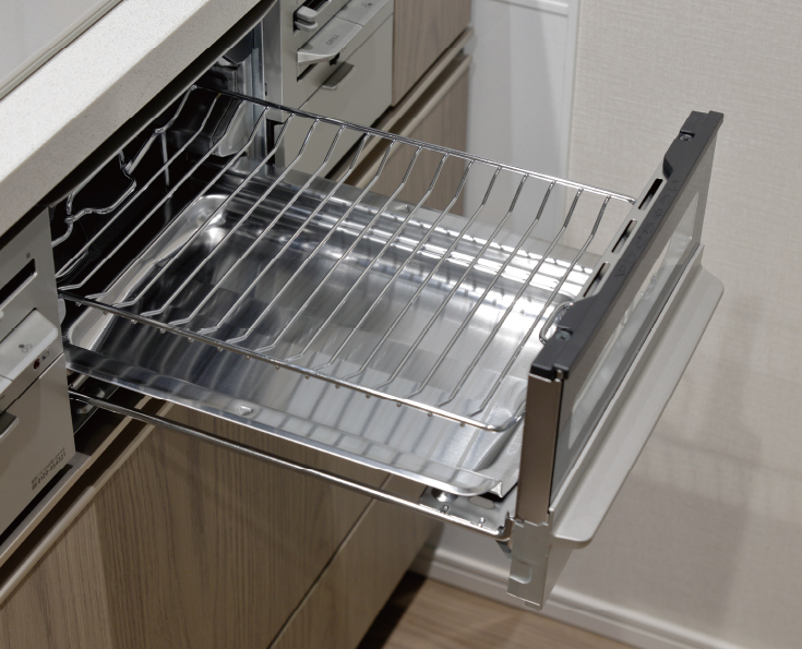 ガスの両面焼きグリルを活用したプレートを採用。油飛びを抑制し直火焼き可能なのでトースト・ノンフライ調理に便利です。