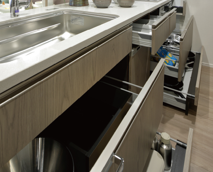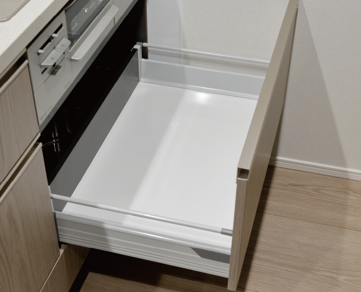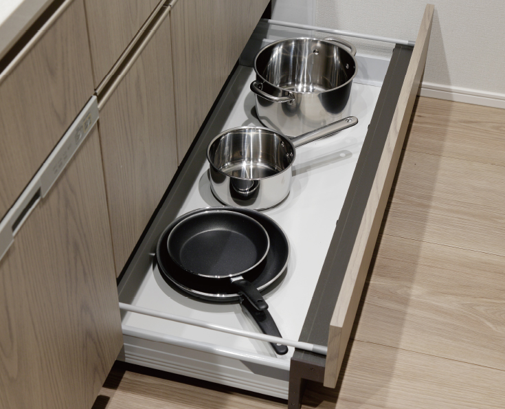 大きな鍋も取り出しやすいオールスライド収納。スムーズで静かに閉じるソフトクロージング機能のブルモーションを搭載。