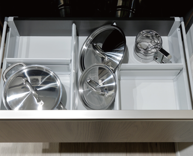 マグネットで取り外し可能な間仕切りを採用。食器や調理器具などさまざまなキッチングッズを収納・整理できる収納を設けています。