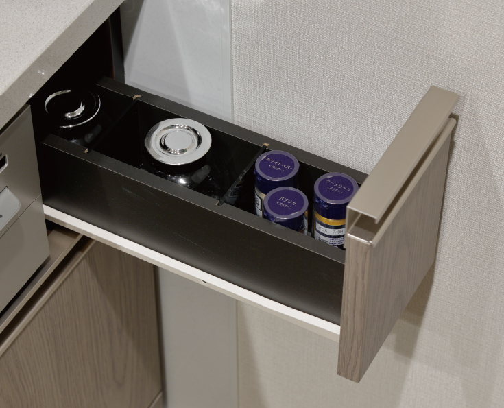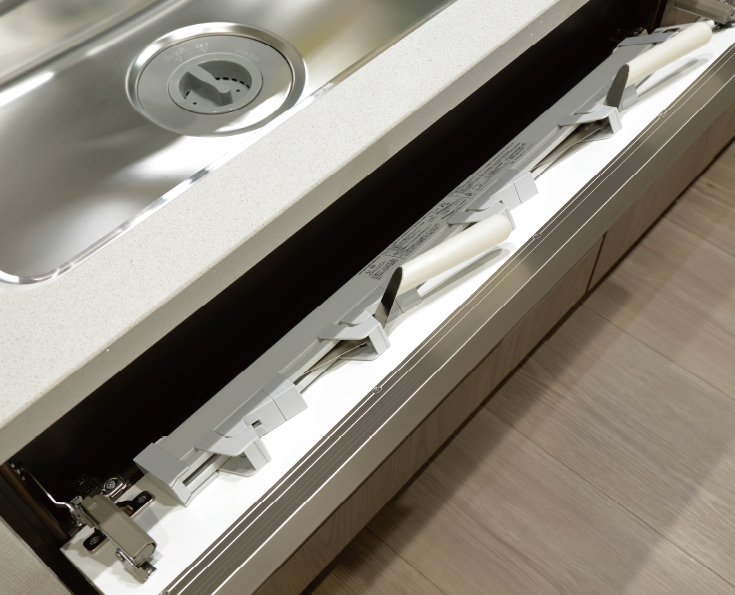 シンク前に包丁専用の収納スペースをご用意。出し入れしやすい位置にあるため、作業効率を高めます。また、チャイルドロック付きで、安心です。