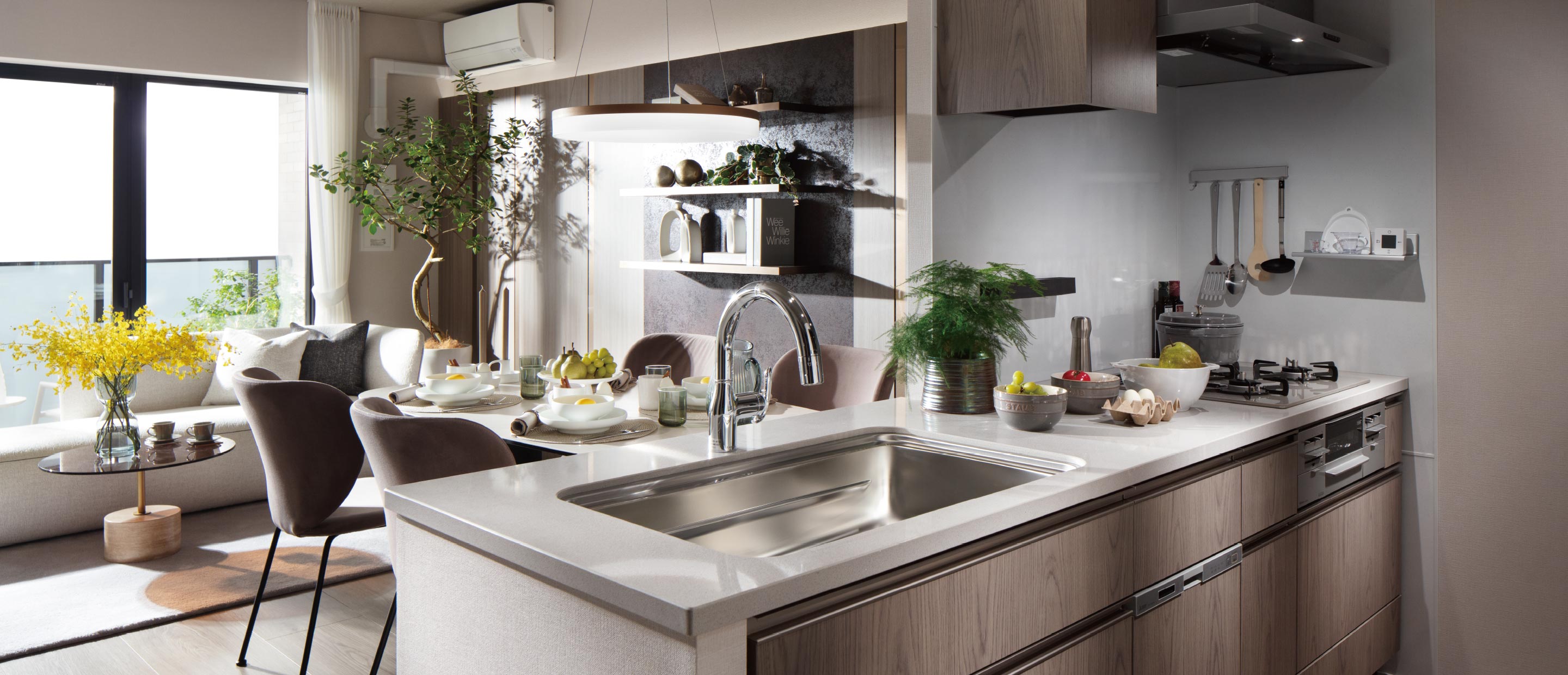 ※掲載の写真は、モデルルーム(Jタイプ)を撮影(2024年11月)したもので、写真の色調等は実際と異なります。有償の造作家具・アクセントクロス・照明・装飾用小物等オプションも含まれております。また、家具・調度品等は販売価格に含まれておりません。詳しくは係員へお尋ねください。