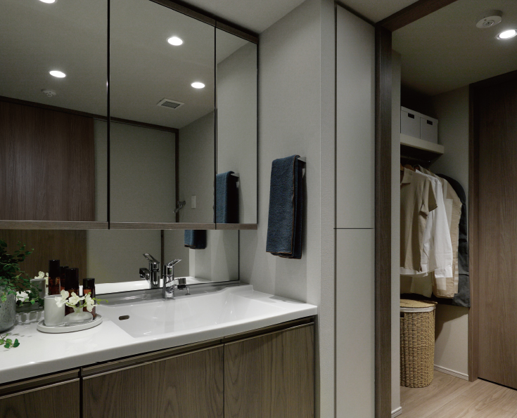 お出かけ前と就寝前の時間を心地よく仕立てる清潔感あふれる空間。豊富な収納や清掃性に優れた仕様で、クリーンに保てる機能性の高さが魅力です。