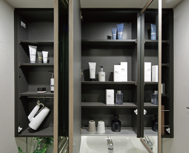 身だしなみのチェックに便利な三面鏡の裏には、豊富な収納をご用意。美しいデザインと機能性を両立させた洗面化粧台です。