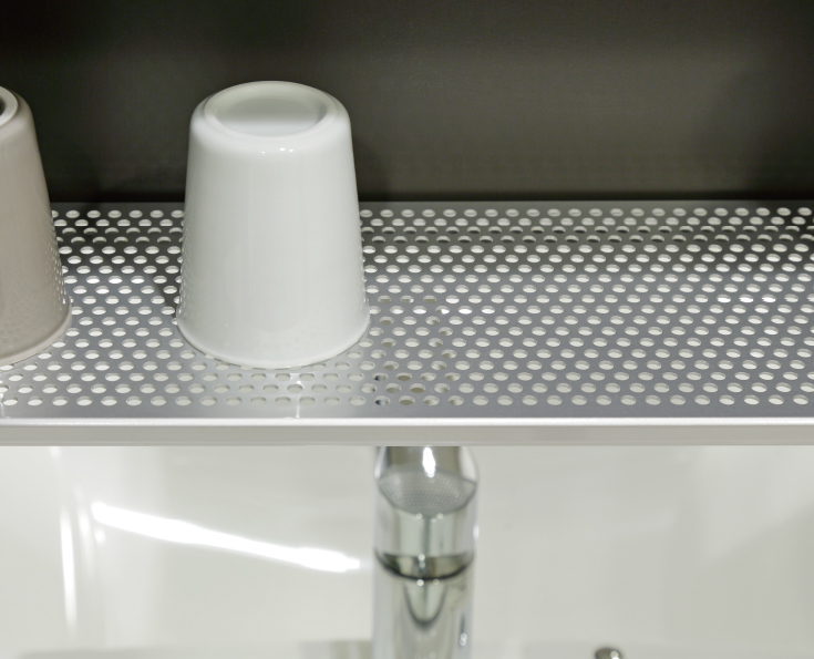 錆に強いアルミ製で通気のための孔があるため水はけも良い棚板を設置。取り外して洗うことができるので清潔さを保てます。