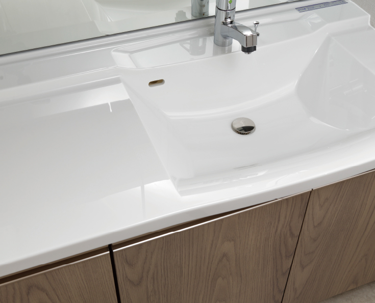 洗面カウンターにはキズや汚れに強い人造大理石を採用。洗面ボウルの位置を片側に寄せることでカウンター部を広く確保でき、2人で並んで身だしなみを整えることができます。