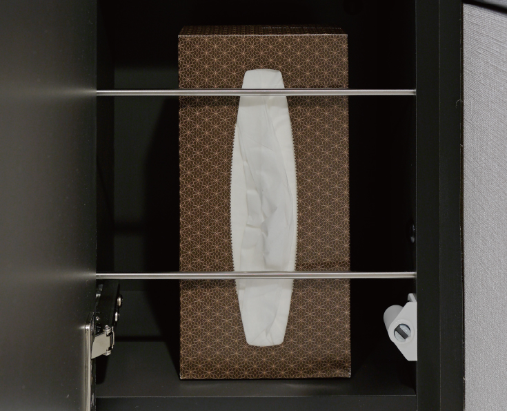 三面鏡裏には、使用頻度の高いティッシュボックスがすっきりと収まるスペースを採用しています。