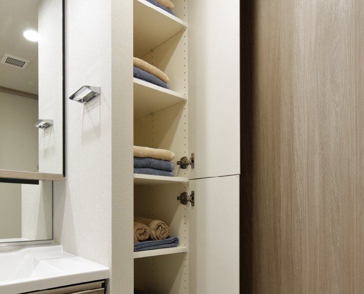 洗面所には、リネン庫を設置。バスルームから出てすぐにタオルやアンダーウエア等が取り出せます。