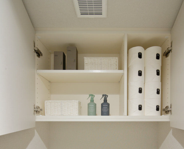 トイレットペーパーなどのストックや掃除用具を収納できる吊戸棚を設置しました。