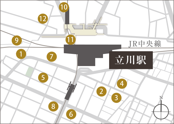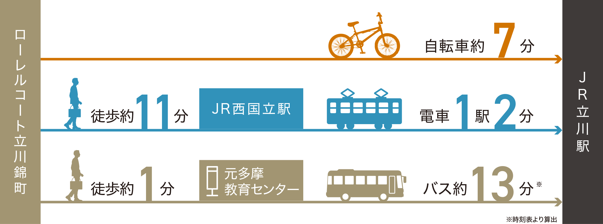 ※「大手町」駅/通勤時:JR南武線利用、「立川」駅にてJR中央線通勤特快、「御茶ノ水」駅にて東京メトロ丸ノ内線乗り換え/日中時:JR南武線利用、「立川」駅にてJR中央線中央特快、「御茶ノ水」駅にて東京メトロ丸ノ内線乗り換え(53分)
