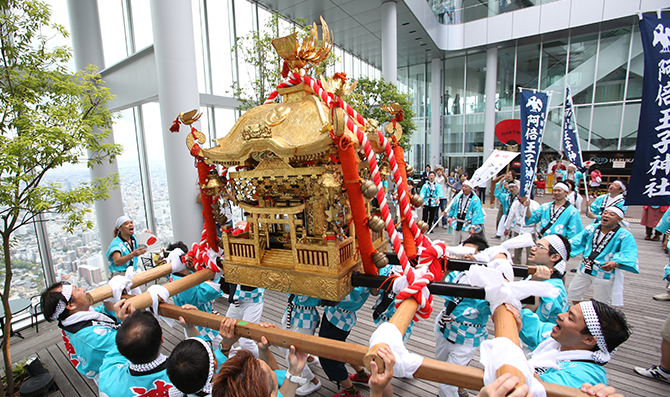 2024年6月にあべのハルカスの展望台「ハルカス300」において、あべのハルカス建設時をはじめ、様々な場面で安全祈願をいただいている阿倍王子神社の「阿倍野神輿」による地域の安寧と繁栄祈願を実施しました。神社で厄除け祈願を受けられた地域の方々から「厄年に神輿を担いて神様のお役に立ちたい」という希望が寄せられ、地元に立地し、地元と共に歩む「あべのハルカス」は2018年の神輿の復活に協力させていただきました。