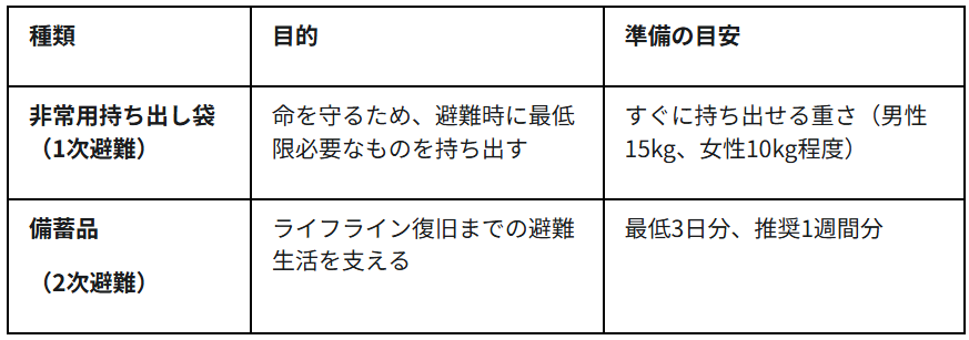 防災グッズは「非常用持ち出し袋」と「備蓄品」の2種類