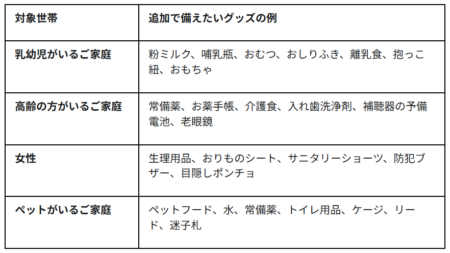 最低限必要な防災グッズに加えて、ご家庭の状況に合わせたアイテムを準備することで、避難生活の困難を軽減できます。ここでは、特に準備が必要となる世帯別に、追加しておきたい防災グッズをご紹介します。乳幼児がいるご家庭向けの備え