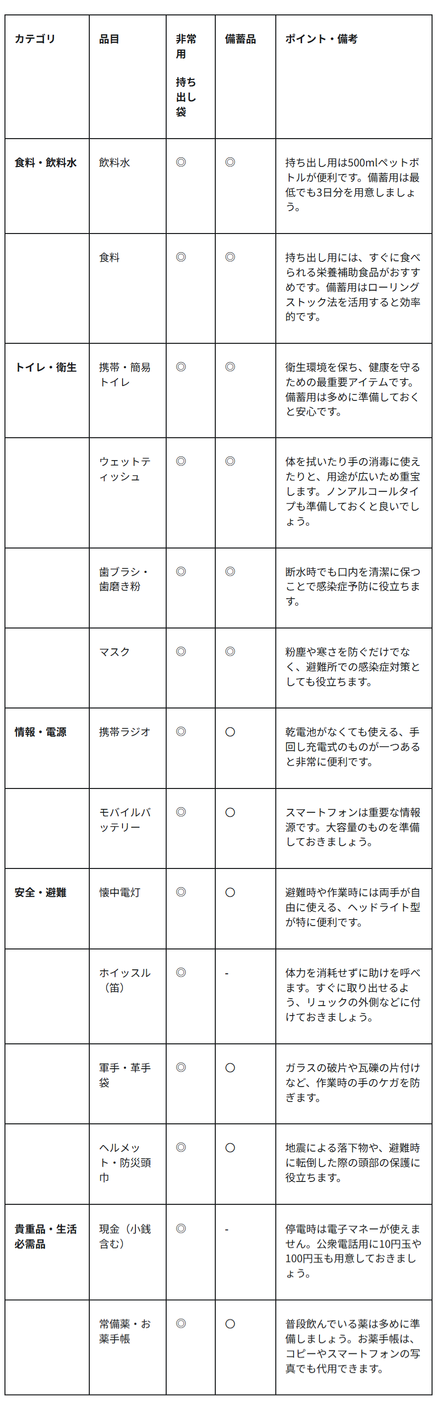 防災グッズの必要性は分かっていても、「具体的に何を揃えればいいの?」と悩む方も多いでしょう。ここでは、非常用持ち出し袋と備蓄品として、最低限これだけは準備しておきたい基本的な防災グッズをリストアップしてご紹介します。