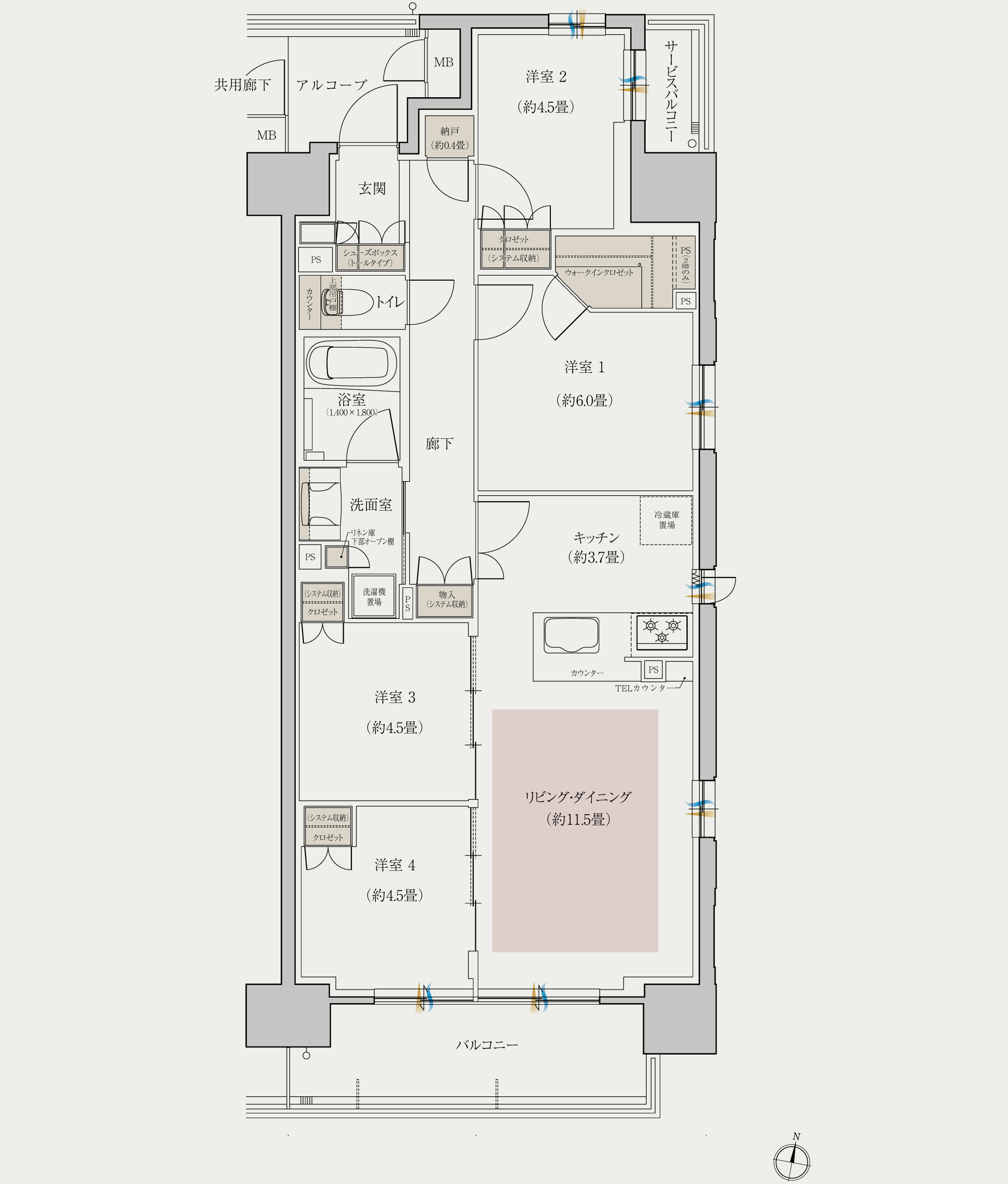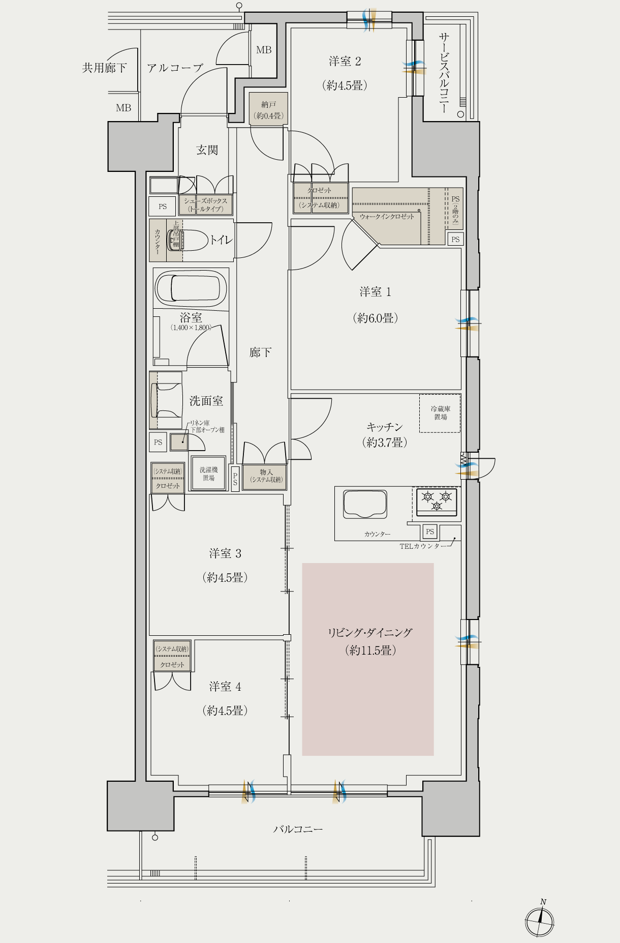 バルコニー面積/約8.59㎡(約2.59坪)サービスバルコニー面積/約2.00㎡(約0.60坪) アルコーブ面積/約3.71㎡(約1.12坪)