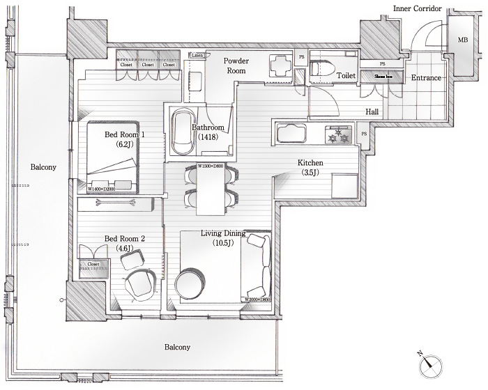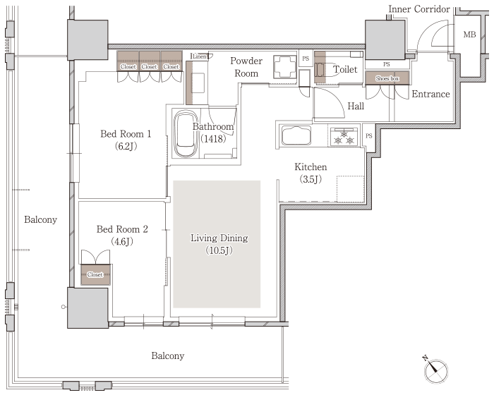 通風・採光に優れた2LDK角住戸プラン