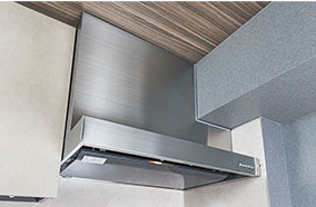 油煙をすばやく吸収するスタイリッシュなレンジフード。油汚れも簡単に拭き取れるホーローを採用した整流板付きです。