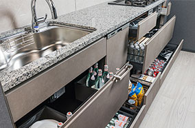 調味料・調理器具などを取りやすく配置。閉める際に指が挟まらないように配慮したソフトクローズ付きです。