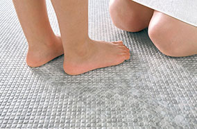 床の内側にクッション層を持ち、畳のようなやわらかさを実現。ひざをついても痛くなく、断熱材の役割もあり、冬場の一歩目もヒヤっとしません。