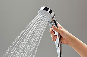 大粒の水玉をスイングしながら勢いよく吐水。適度な刺激のある浴び心地と大幅な節水を実現します。加えて、手元ボタンでシャワーの出し止めすることで、さらに節水できます。