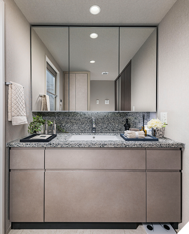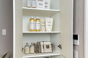 洗面室には、空間をすっきり片付けられる便利なリネン庫をご用意しました。