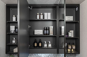 くもり止めヒーター付ミラーの三面鏡を採用。裏面に収納スペースが確保され化粧品などもすっきりと片付けられます。