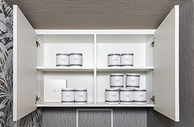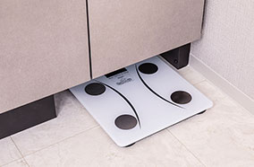 洗面台の下に専用の空間を設け、置場に困りがちなヘルスメーターをすっきり収納できるようにしました。