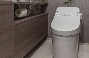 暖房便座付きのウォシュレット一体形便器を採用。13L便器からおよそ3分の1の洗浄水量へ。普段どおり使っているだけで、いつの間にか節水できます。