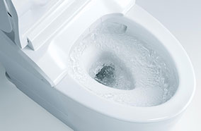 渦を巻くようなトルネード洗浄が、少ない水で効率的に洗浄します。汚物が付着しやすい便器後方に勢いよく水が当たるので、汚れをしっかり洗い流します。