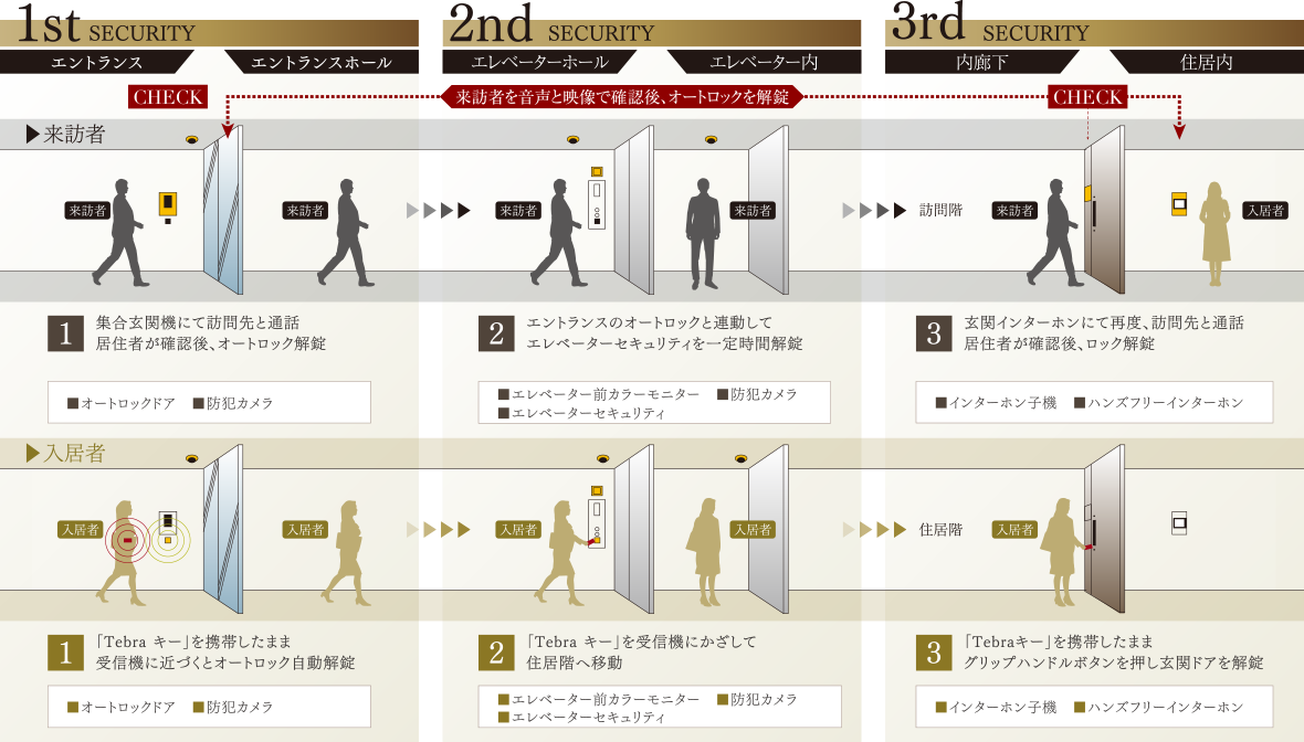 敷地外から各住戸にかけて複合的なセキュリティラインにより、安心・安全という基盤のもと、