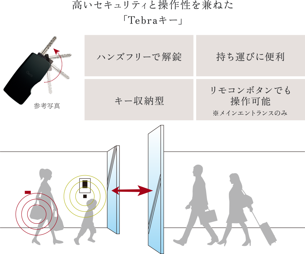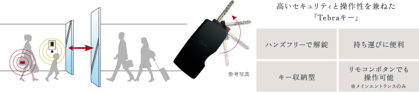 ※「Tebraキー」は1住戸3個となります。※作動範囲はリーダから半径最大約80㎝以内です。距離は一般的な目安であり、状況により異なります。