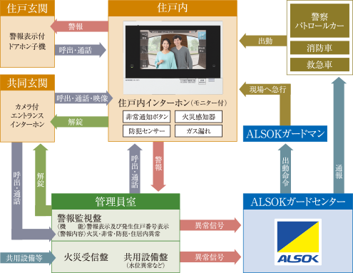 ALSOK(綜合警備保障)と連携したセキュリティネットワークにより各住戸はもちろん、共用部の設備や火災などの異常を24時間365日体制で監視します。