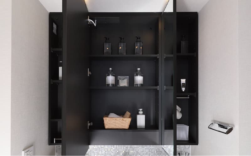 くもり止めヒーター付(一部)ミラーの三面鏡裏には収納スペースを確保しています。