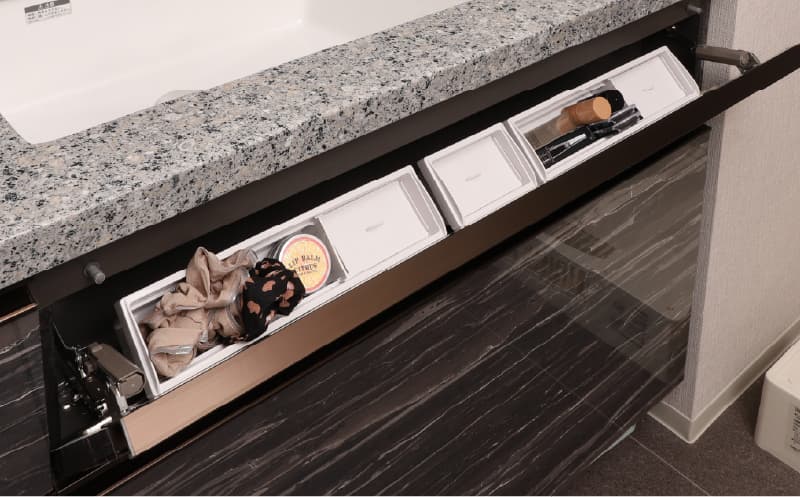 奥にしまったものでも楽に出し入れできるスライド式収納を採用。また、巾木部分にも小物などを整理できる収納(一部タイプ除く)を確保しました。
