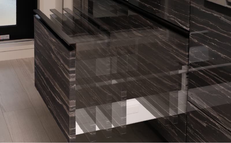 システムキッチンのカウンタートップと側板には、高級感と上質感のある天然御影石を採用。デザイン性が高く、傷がつきにくいのも特徴です。