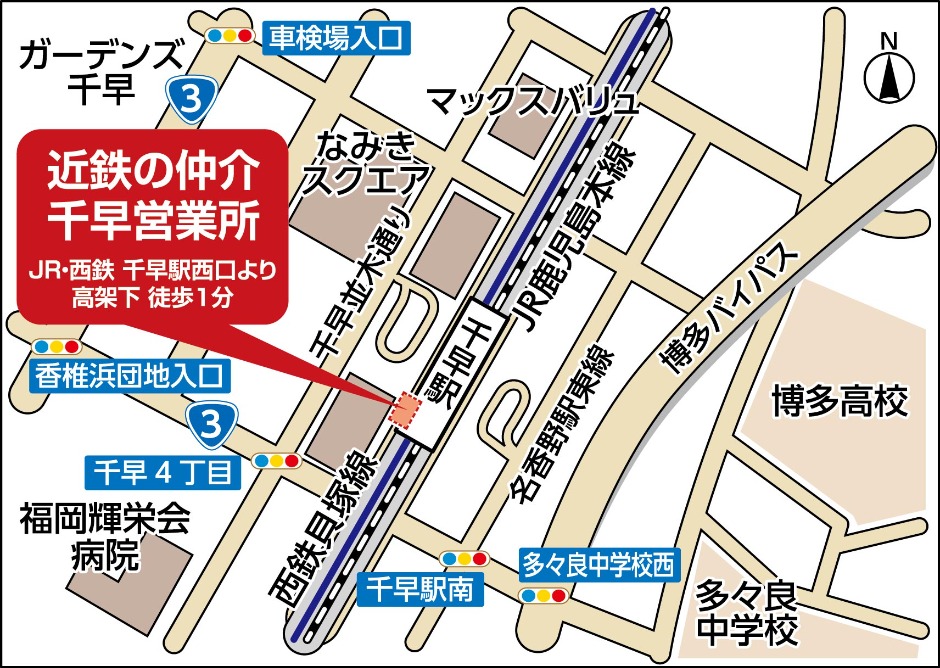 当営業所は、身近に相談できる不動産窓口として、アクセスのよいJR鹿児島本線「千早」駅、西鉄貝塚線「西鉄千早」駅近くの高架下に開設します。