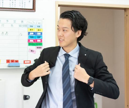 不動産仲介営業は、お客様のお役に立つ「不動産のプロフェッショナル」として、幅広い知識や経験が求められます。時には、難しいお取引はありますが、先輩社員の手厚い指導や充実した研修制度があるので、安心して挑戦できる環境が整っています。この点も、私が入社を決めた理由の一つです。