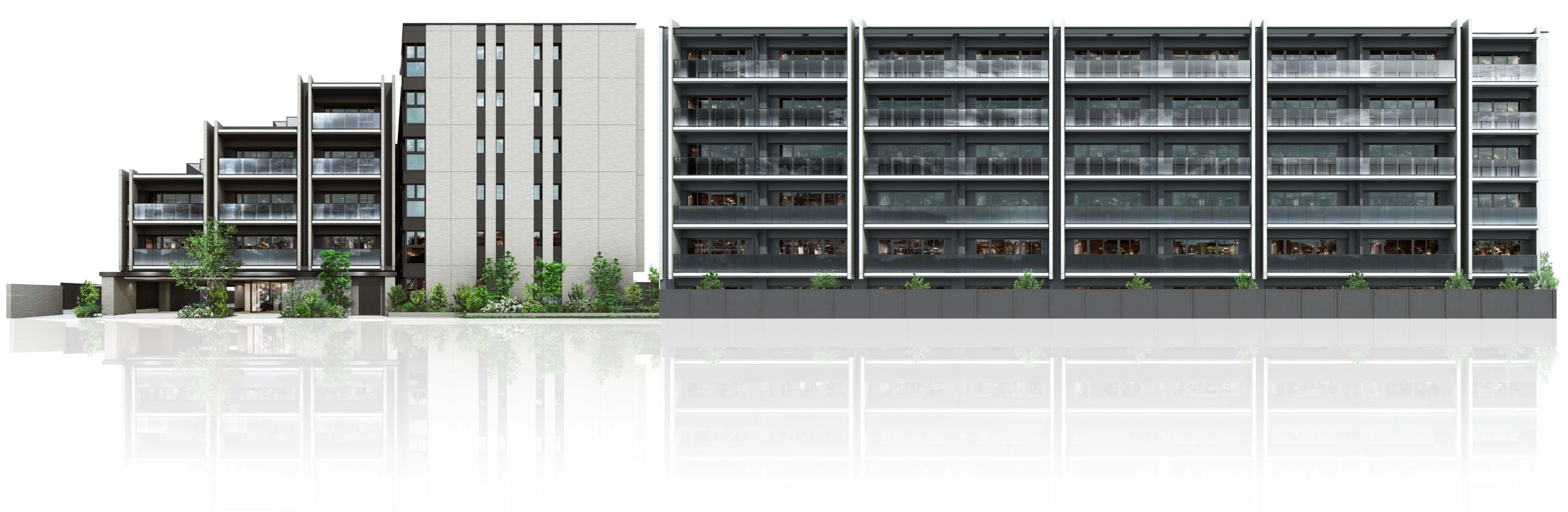 ※掲載の外観完成予想CGは西側正面と南側正面を並列させたもので実際の見え方とは異なります。