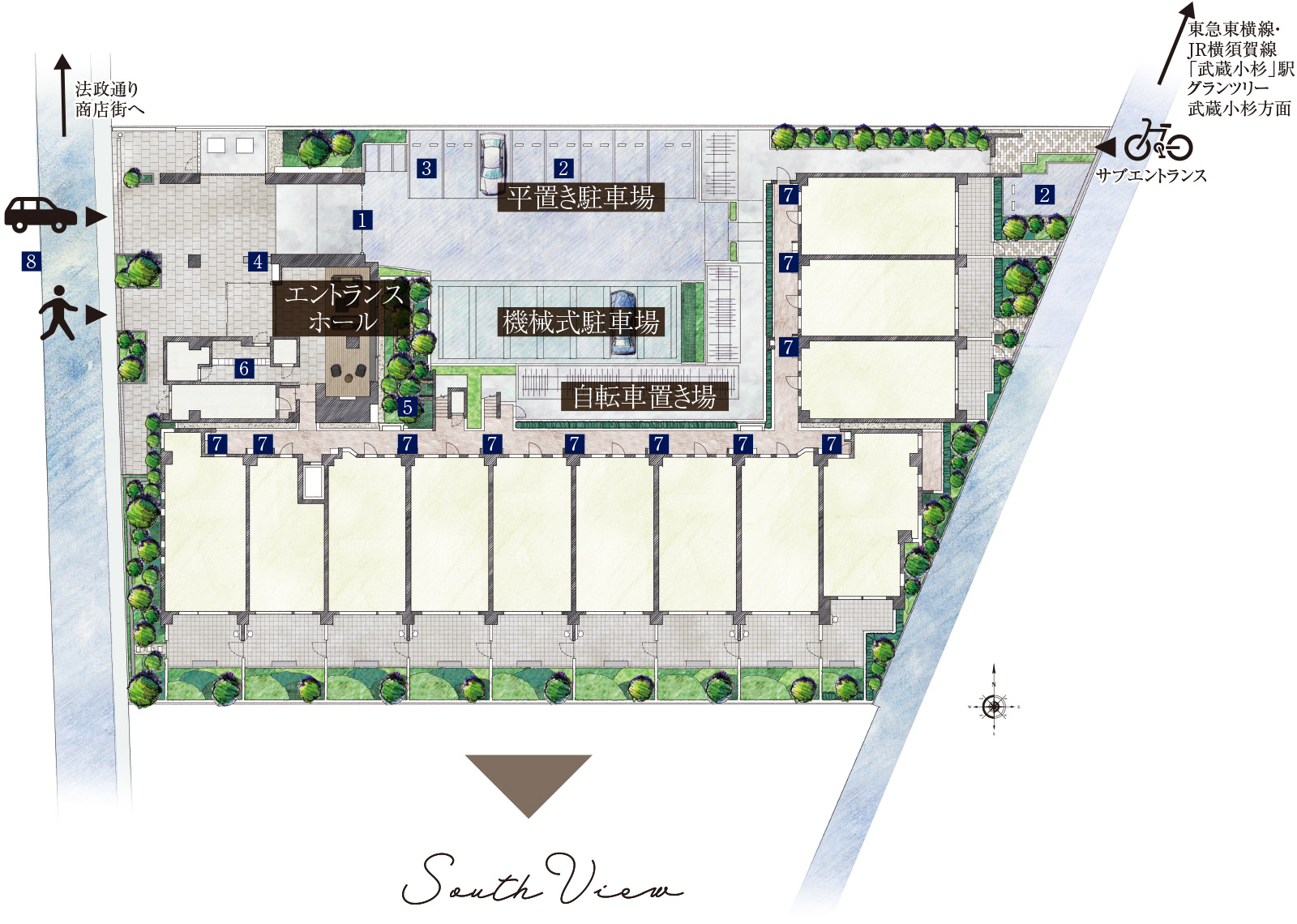 敷地内には、機械式のほかに、愛車の乗り降りがスムーズな平置駐車場を9台分確保しました。※全30台中平置き区画9台(身障者用含む)