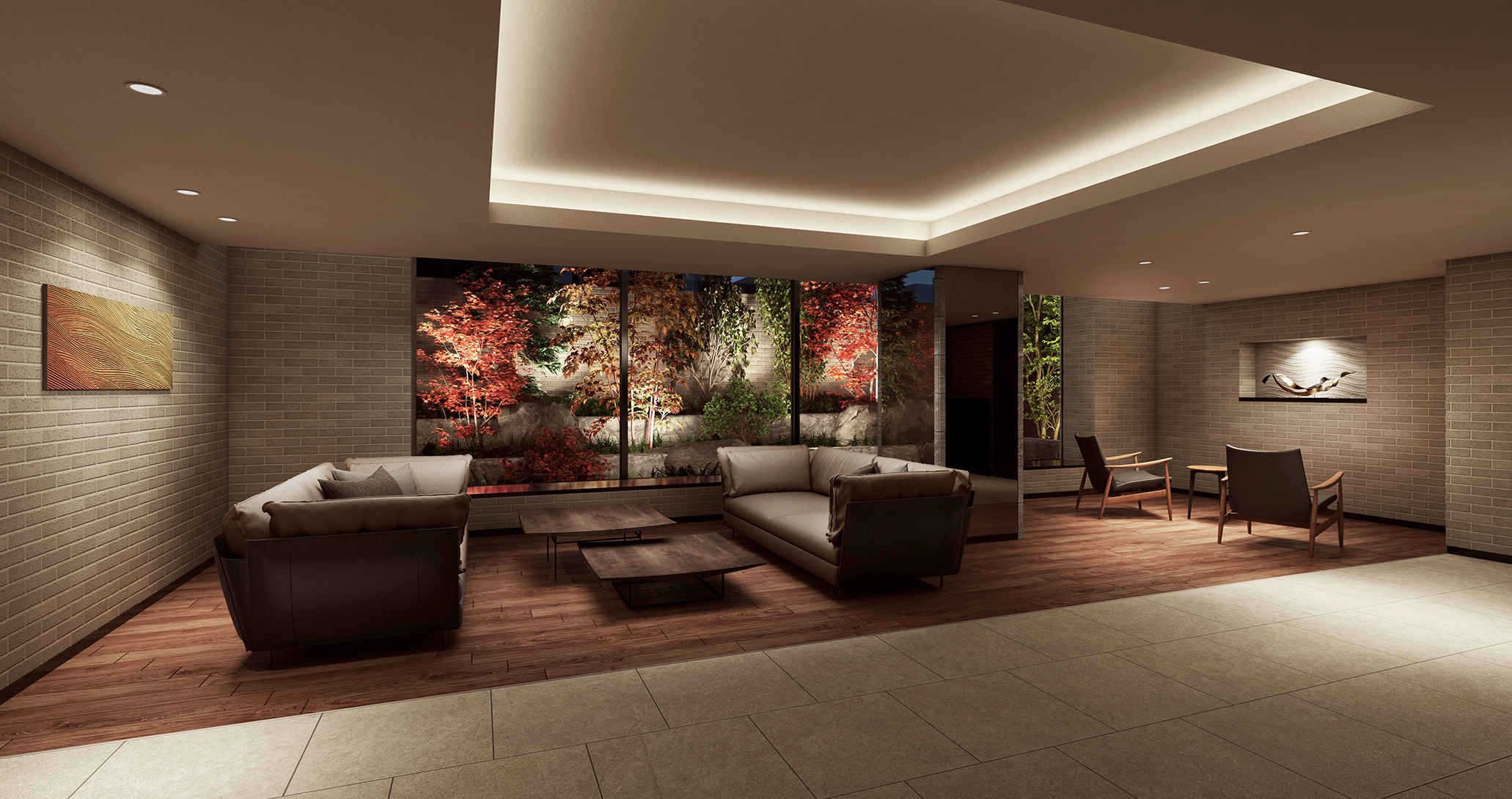 エントランスホールに隣接した、豊かな植栽計画によって花や樹々の彩りがあふれる庭。ワイドな窓面の向こうに、季節ごとの美しい表情を楽しむことができます。