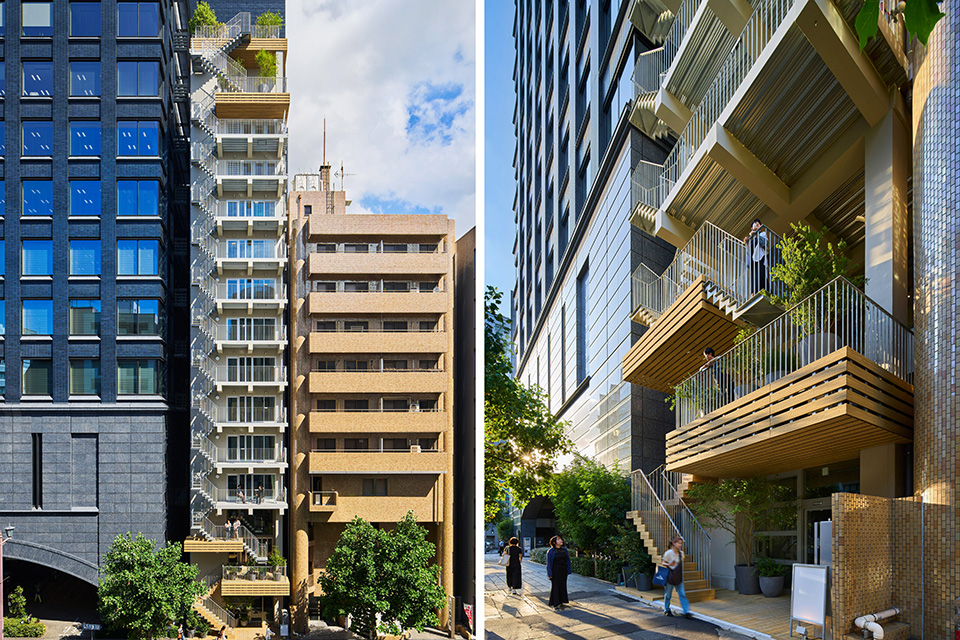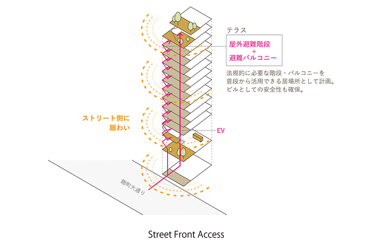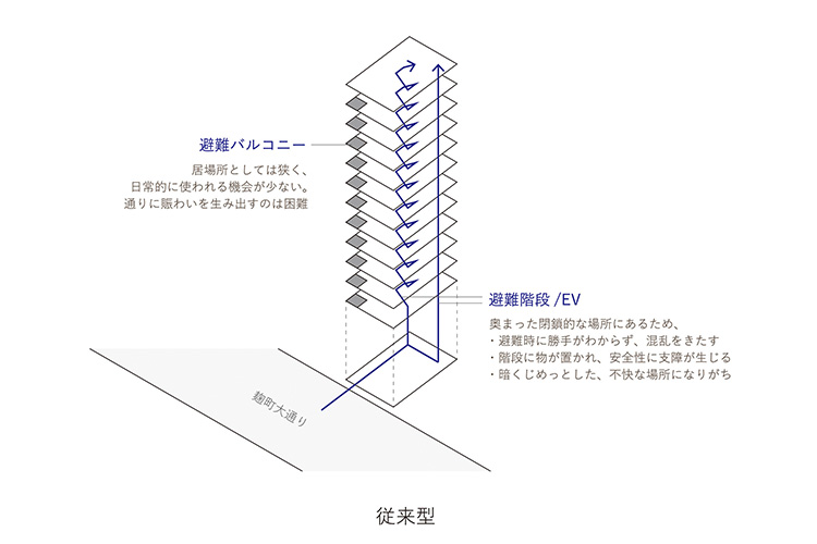 従来型のペンシルビルの建築形式とは異なり、エレベーターと屋外避難階段を大通り沿いの前面側に設置する「ストリートフロントアクセス」という新しい形式を採用。バルコニーや避難階段を日常的に使われる空間として設計することで、避難経路の認知度向上につながり、避難時の安全性を高めています。