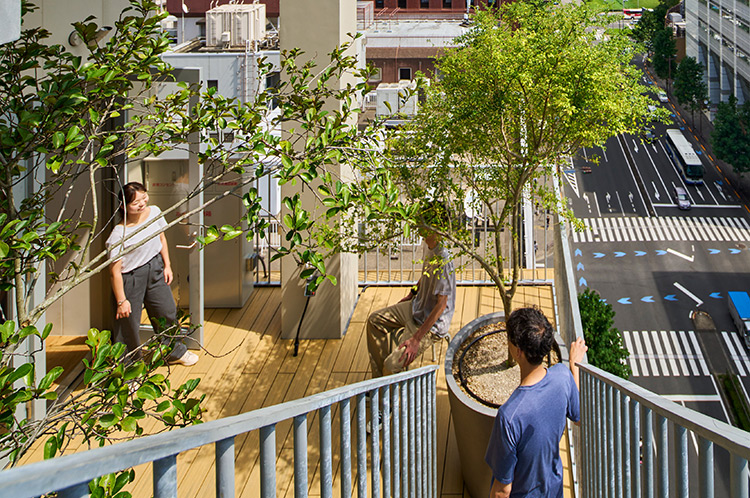 バルコニーは面積を最大化することで、ベンチや植栽を置いて日常の居場所として自由に使える空間に。また、バルコニーに面したオフィス空間は、どこにいても街とのつながりを感じる開放感が魅力です。