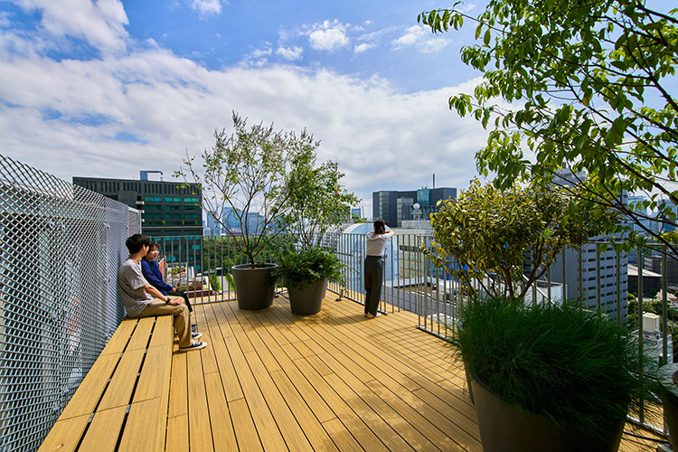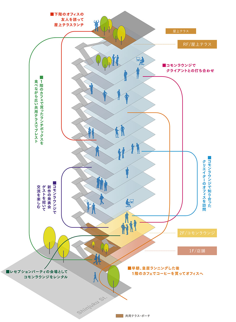 街の賑わいを縦に積層するようにデザイン。オフィスワークの合間に屋上テラスでリフレッシュしたり、会議室・キッチン完備のコモンラウンジを活用するなど、各フロアを自由に行き来することで、入居者同士の積極的なコミュニケーションを促進。新たなイノベーションの発想が生まれる場づくりをめざしています。